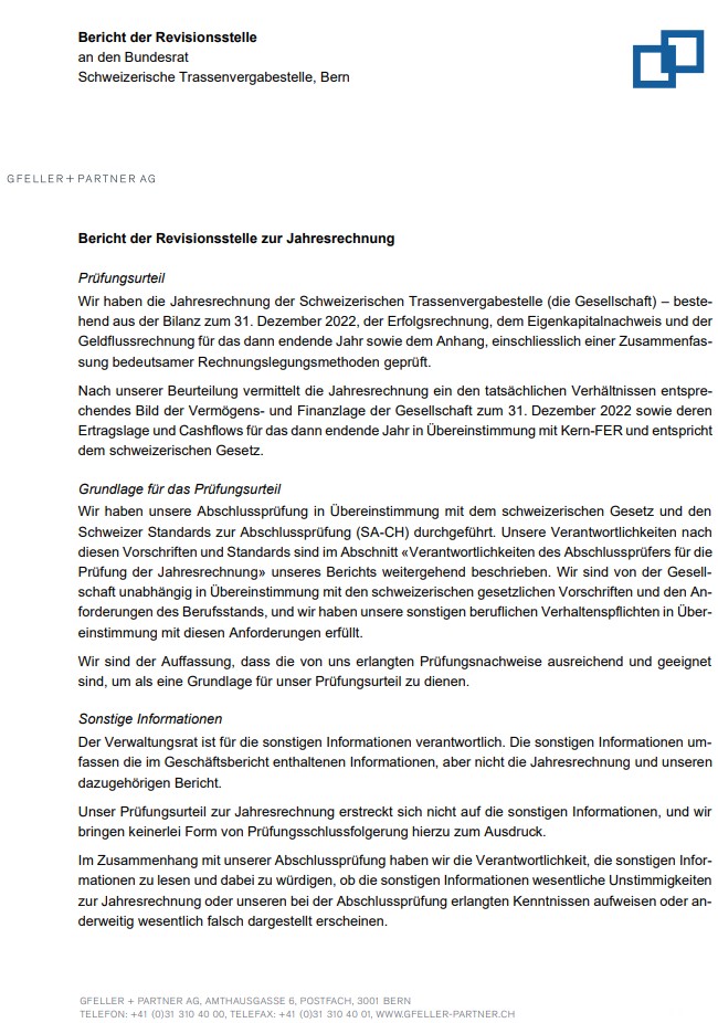 Die Jahresrechnung der TVS wurde vom Verwaltungsrat am 7. Februar 2023 verabschiedet, vorbehältlich der Genehmigung durch den Bundesrat.